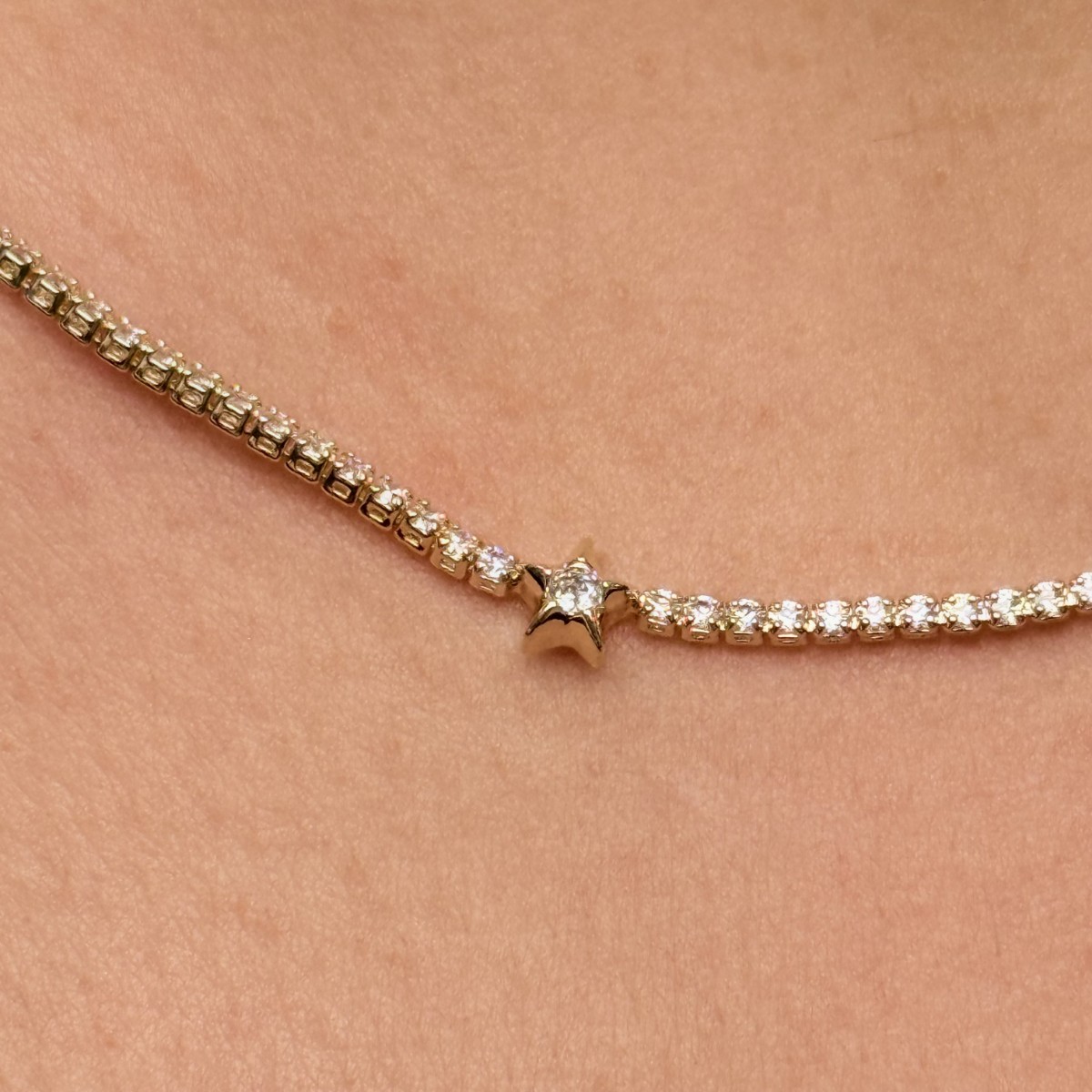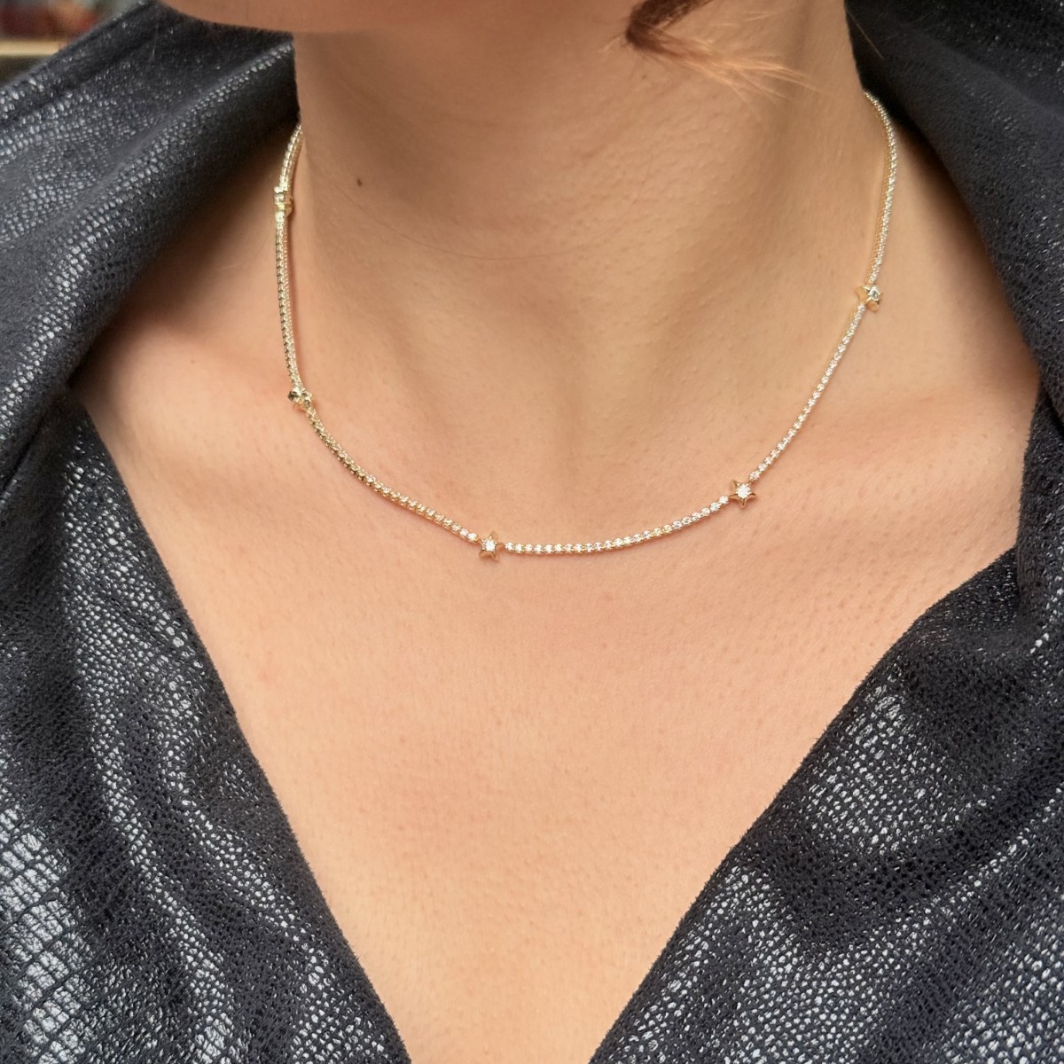 Taşlı zincir boyunca serpiştirilmiş yıldız detaylarıyla zarif bir parıltı. Hem klasik hem modern çizgide.