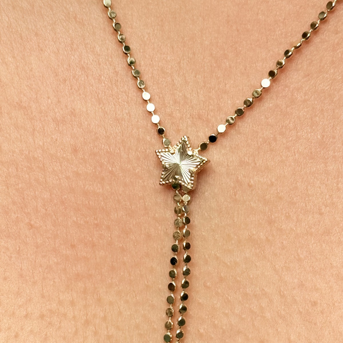 Altın renk zincirin sıcak tonuyla ince yıldız detayı birleşiyor. Şık ve feminen bir görünüm.
