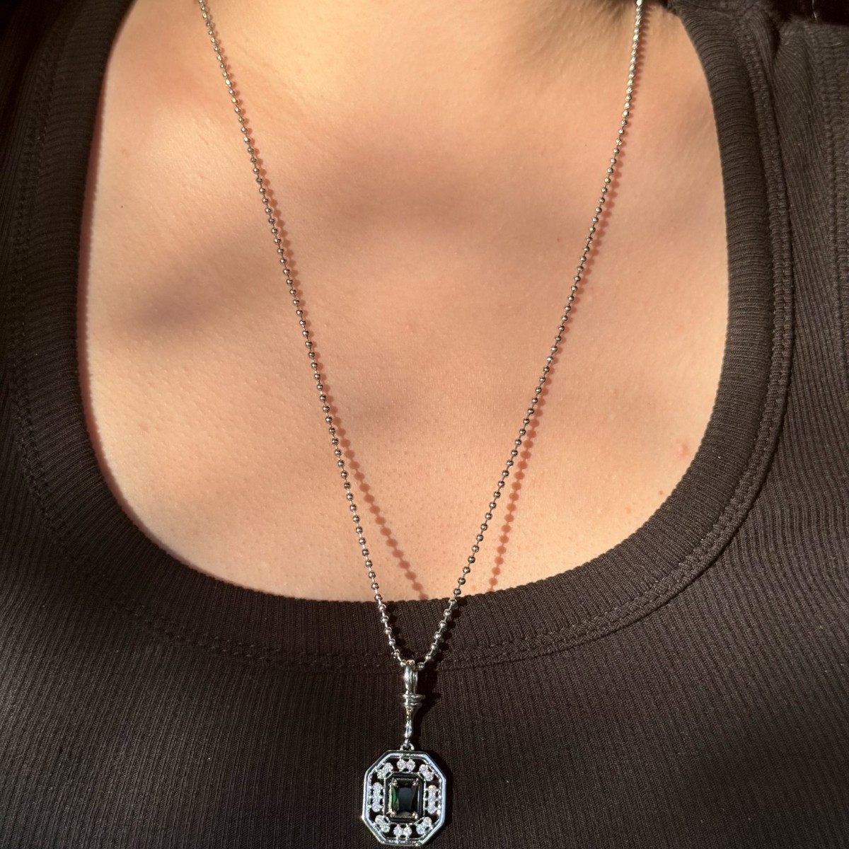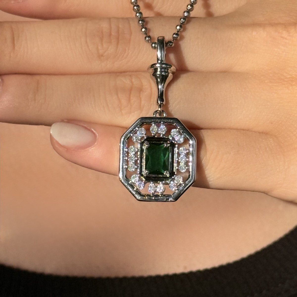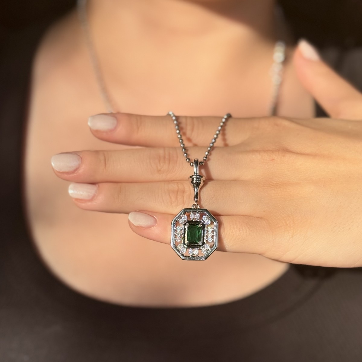 Zarif Sekizgen Form – Gümüş Zincirli Yeşil Taşlı Kolye