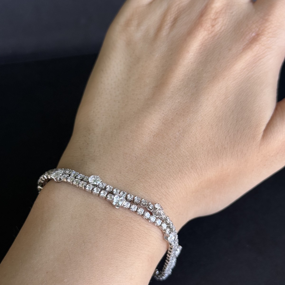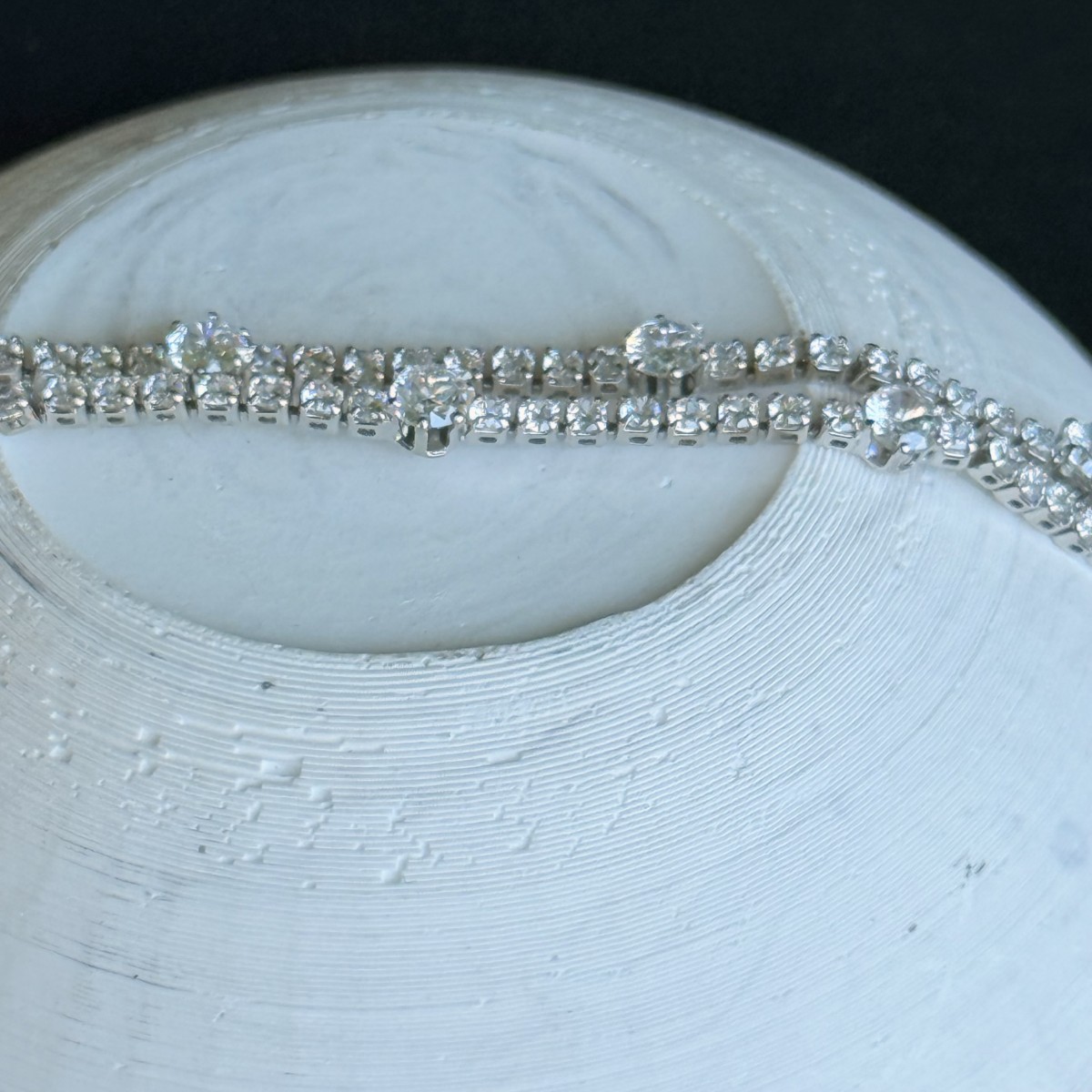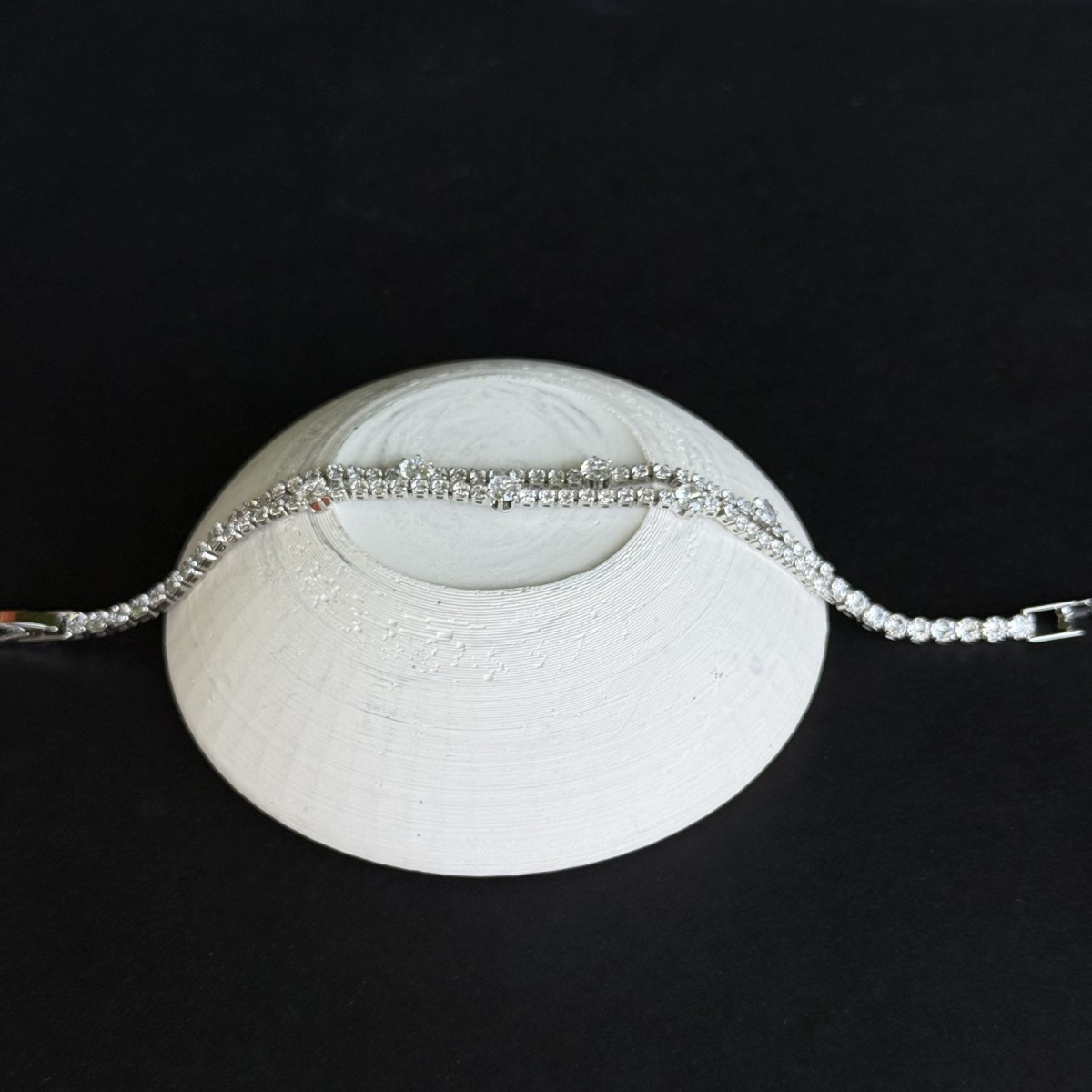 Ortadan ikiye ayrılan ve kenarlarda birleşen özel tasarımıyla dikkat çeken bu bileklik, üst kısmındaki parlak taş detaylarıyla hem sade hem de gösterişli bir görünüm sunar.